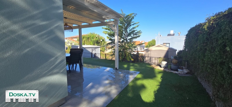 Частный сад с перголой, столом, стульями и махсаном.